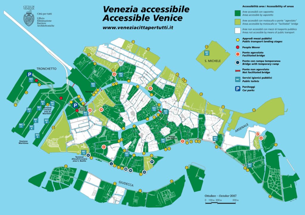Gefunden habe ich deshalb diese barrierefreie Karte der Stadt Venedig (leider das letzte Mal 2017 aktualisiert, aber baulich hat sich in Venedig gefühlt schon seit über 100 Jahren nichts mehr getan): Auf der offiziellen Seite der Kommune Venedig.